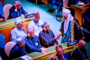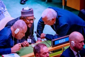President Buhari is with Chief of Staff Prof. Ibrahim Gambari, Minister of Foreign Affairs Geoffrey Onyeama, Permanent Representatives of Nigeria to UN Prof. Tijani Muhammad-Bande, Minister of Finance Hajia Zainab Ahmed and Minister of Humanitarian Affairs Sadia Umar Farouq.