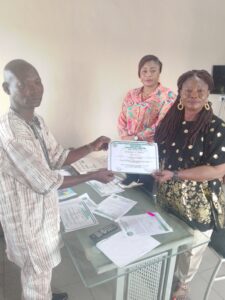 Mrs Ilesanmi Olukemi (right) receiving her certificate of return from the VP Southwest, Ajayi Obe (left), while new Chairperson, Ms Oladunni Olatutu looks on